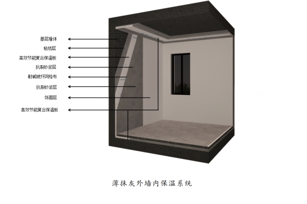 由(yóu)粘結層(粘結砂漿(jiāng)或粘結石膏(gāo))、保(bǎo)溫層、抹麵膠(jiāo)漿(或抹灰石膏)內壓入耐堿玻璃纖維網布的抹麵層、塗裝材料(包括塗料(liào)、飾麵砂漿、柔性飾(shì)麵材料)的飾麵層等組(zǔ)成的置於建築物外牆內側的外牆(qiáng)保溫構造的總稱。簡稱高效節能複合保溫板(bǎn)薄抹(mò)灰(huī)外牆內保溫(wēn)係統。